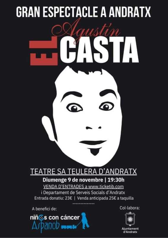 El humorista Agustín “El Casta” llega este domingo 9 de noviembre al Teatre Sa Teulera de Andratx con un espectáculo solidario lleno de ingenio y energía. La cita, organizada con la colaboración del Ajuntament d’Andratx, destinará toda la recaudación a beneficio de la asociación Aspanob, en apoyo a los niños con cáncer y sus familias.