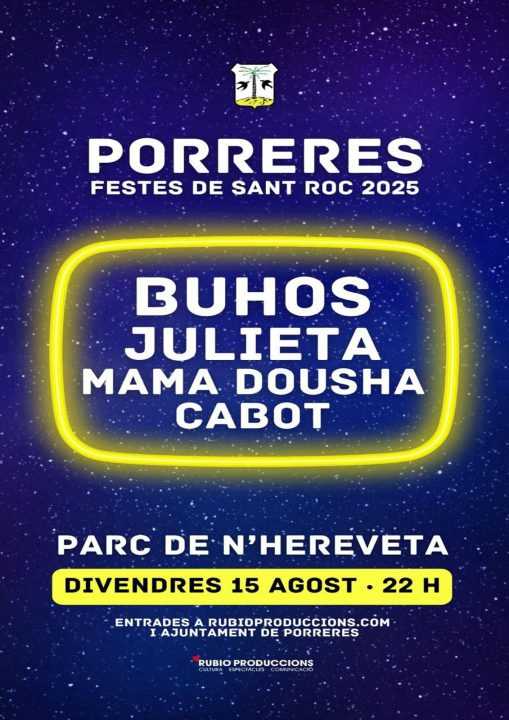 El próximo viernes 15 de agosto a las 22 h, el Parc de n’Hereveta de Porreres se convertirá en el epicentro musical del Pla con un cartel de lujo dentro del programa de las Festes de Sant Roc 2025. Actuarán Buhos, Julieta, Mama Dousha y Cabot, cuatro propuestas de primer nivel que garantizan una velada llena de energía, ritmo y conexión con el público.