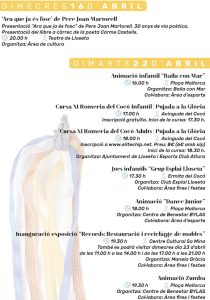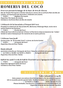 La Romería del Cocó ya está aquí, y desde el 16 hasta el 24 de abril, Lloseta se convierte en un espacio de celebración con una variada programación de actividades. Habrá presentaciones de libros, animación infantil, exposiciones, baile de bot, talleres de crespells, cuentacuentos para pequeños y grandes, y la carrera Subida a la Gloria, entre otras actividades.