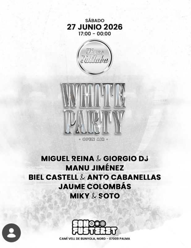 La festa White Party Open Air d’El Que Faltaba Tardeo se celebrarà el dissabte 27 de juny de 2026, de 17.00 a 00.00 hores, a Son Fusteret, Palma. La cita reunirà diversos DJs en un gran tardeo a l’aire lliure dins una de les propostes festives destacades de l’estiu a la ciutat.