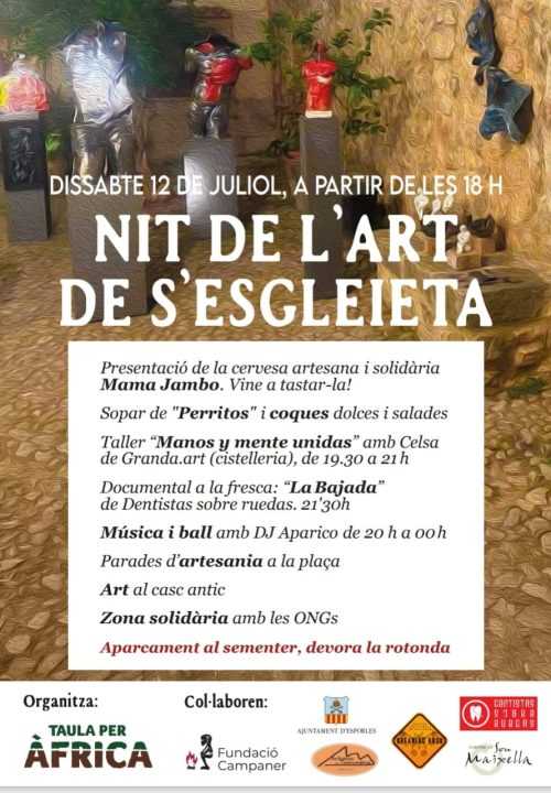 S’Esgleieta acollirà aquest dissabte 12 de juliol, a partir de les 18 h, una nova edició de la Nit de l’Art, una trobada cultural i solidària organitzada per Taula per Àfrica. L’esdeveniment inclourà la presentació de la cervesa artesana i solidària Mama Jambo, sopar popular amb “perritos” i coques, un taller de cistelleria amb Celsa de Granda.art i la projecció del documental La Bajada, del col·lectiu Dentistas sobre ruedas.