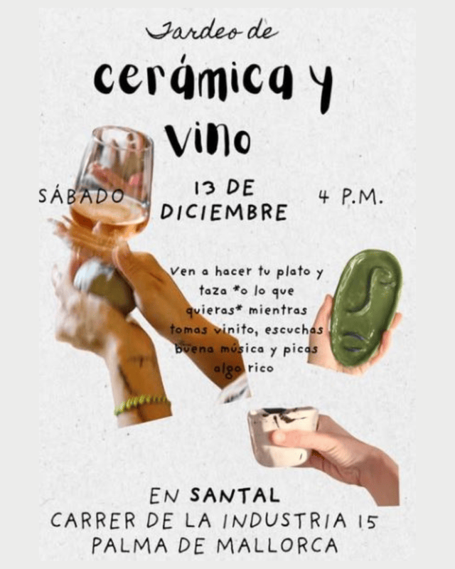 El dissabte 13 de desembre, a partir de les 16.00 h, Santal (Carrer de la Indústria, 15, Palma) acollirà una tarda creativa amb ceràmica, vi i bona música. Els participants podran elaborar la seva pròpia peça mentre gaudeixen d’un ambient relaxat, picar alguna cosa i compartir experiències.