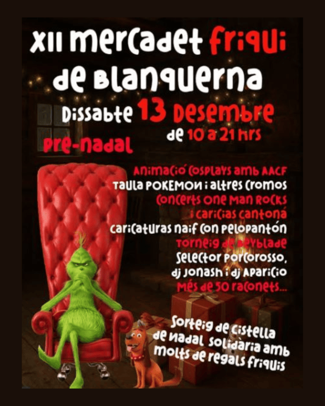 El dissabte 13 de desembre, el carrer Blanquerna de Palma acollirà una nova edició del Mercadet Friqui, de 10 a 21 h. Hi haurà més de cinquanta paradetes dedicades al còmic, llibres, figures, videojocs i marxandatge, a més d’animació cosplay, caricatures i música en directe.
